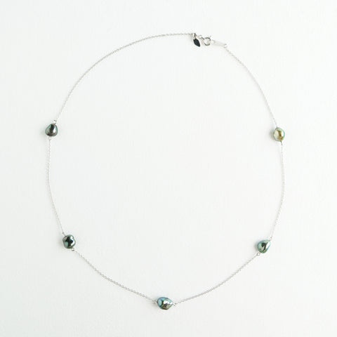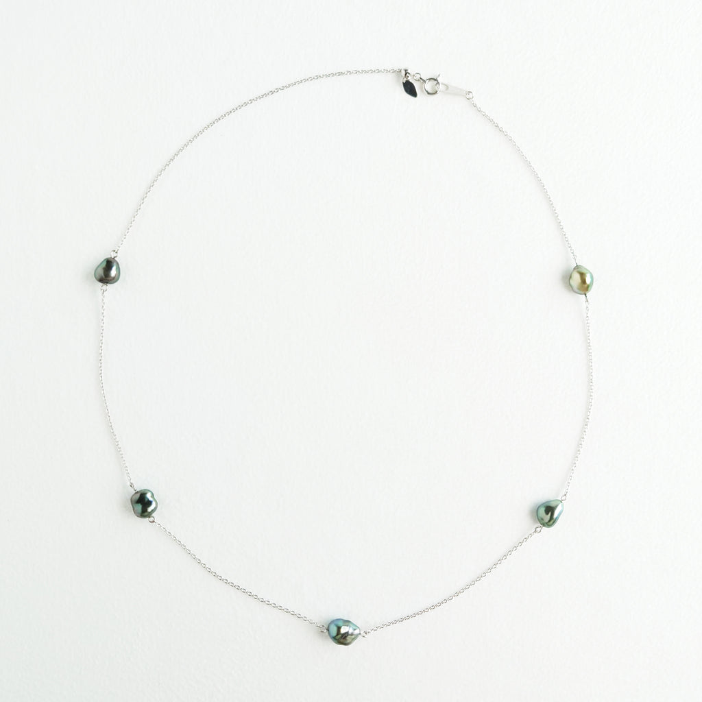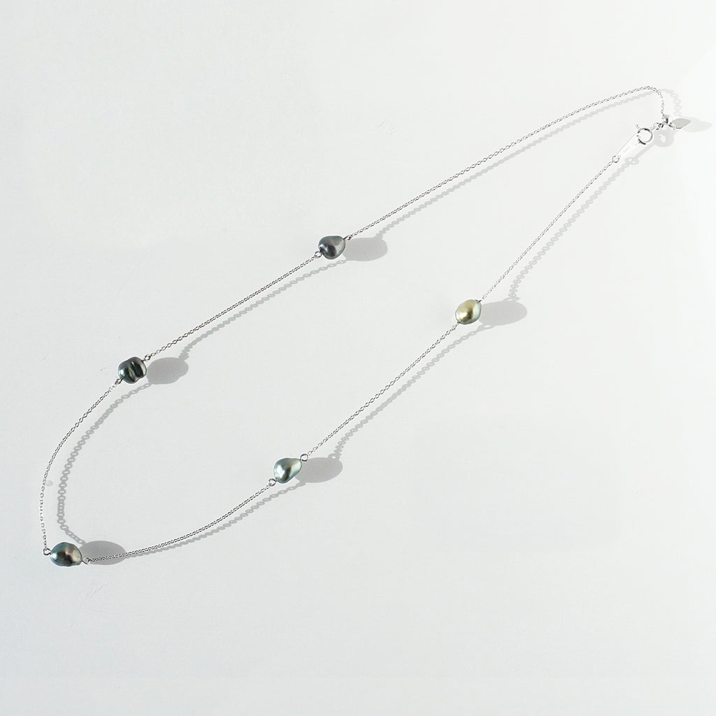 実は黒蝶ケシ真珠はグレーやブラックなどのカラーが主流。深いブルーやグリーンのカラーが発現する確率は極めて低く、数百~数千粒のなかからほんの一握りしか産出されません。類を見ないナチュラルカラーの圧倒的な色彩とテリの良さという個性を纏ったケシ真珠の魅力を、ぎゅっと詰め込んだステーションネックレスになりました。